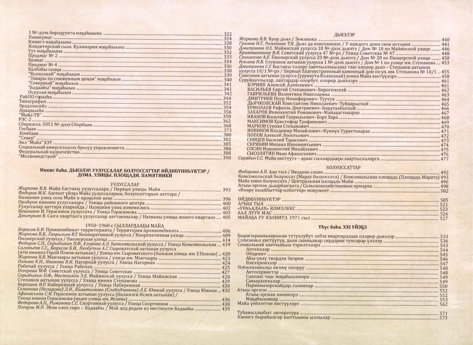 Майа : Докумуоннар. Ыстатыйалар. Хаартыскалар : [икки кинигэлээх] / Мэҥэ Хаҥалас улууһа, Майа сэлиэнньэтэ ; бырайыагы көҕүлээччи Д. И. Тихонов ; кинигэ ис тутулун сүрүннээтэ: С. Г. Дмитриева ; үлэни тэрийдэ А. А. Федорова. - Майа : [и. с.], 2021. - . Кн. 2. - 2021. - 581, [2] с.