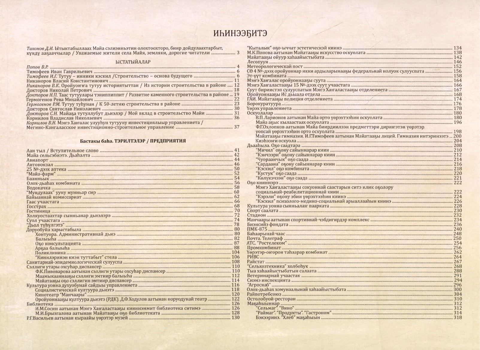 Книга-альбом начинается со статей о развитии строительства в селе Майя. В каких зданиях размещались учреждения и предприятия в XX веке, история домов, площадей, монумент "Өлөрү кыайбыттар өлбөттөр"... Обо всем этом рассказывается на основании достоверных документов. Освещается ход строительства жилых домов по программам, организация работы по благоустройству села в течении многих лет.