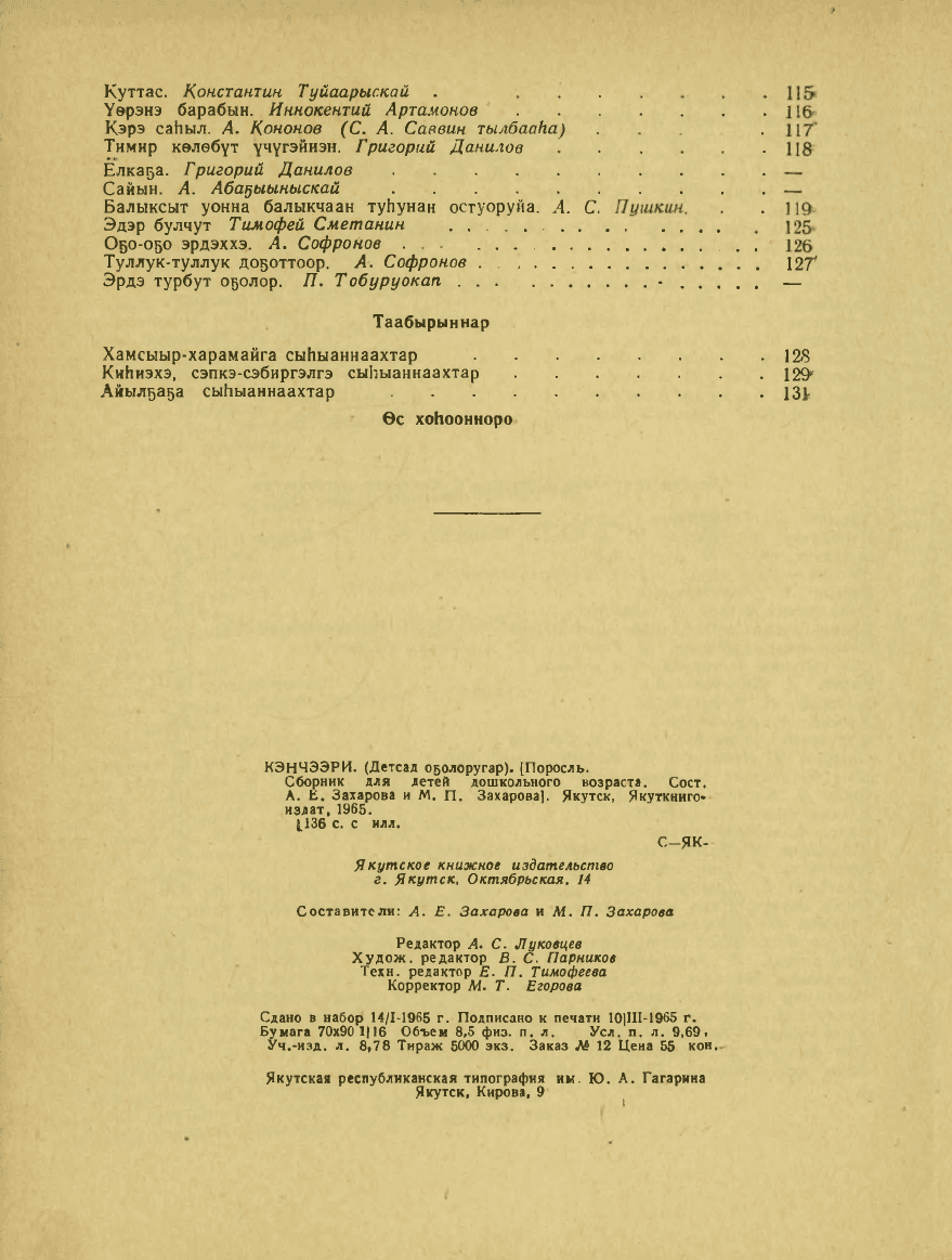 Кэнчээри : (детсад оҕолоругар) / хомуйан оҥордулар: А. Е. Захарова, М. П. Захарова ; художник В. С. Карамзин. - Якутскай : Саха сиринээҕи кинигэ издательствота, 1965. - 135, [1] с.